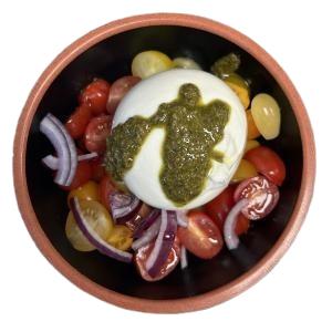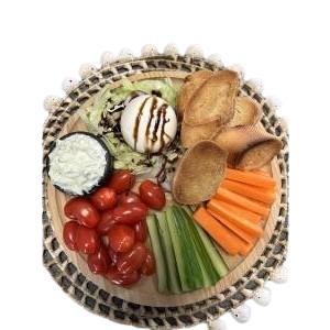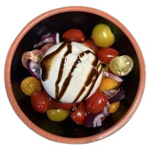 burrata et son filet balsamique et ses tomates cerises, tzatzíki accompagné de ses toasts et batônnets de carottes et concombres